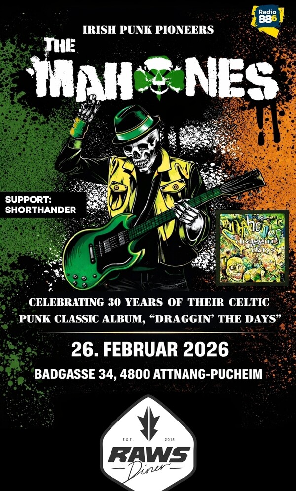 Die Celtic-Punk-Legenden The Mahones kommen am 26.02.2026 auf die Bühne! Als echte Irish Punk Pioneers stehen sie für energiegeladene Shows mit Folk-Melodien und rauem Punk-Sound. Mit im Gepäck: jede Menge Hymnen zum Mitsingen und Feiern.