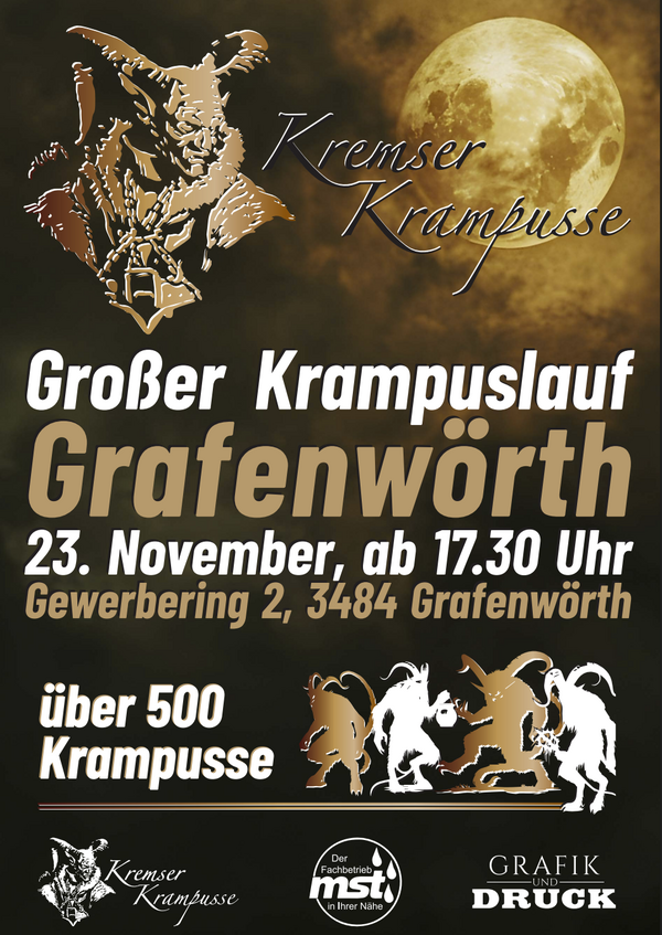 Am 23. November findet in Grafenwörth der große Krampuslauf statt. Mehr als 500 Krampusse sorgen ab 17:30 Uhr für eine beeindruckend schaurige Atmosphäre.