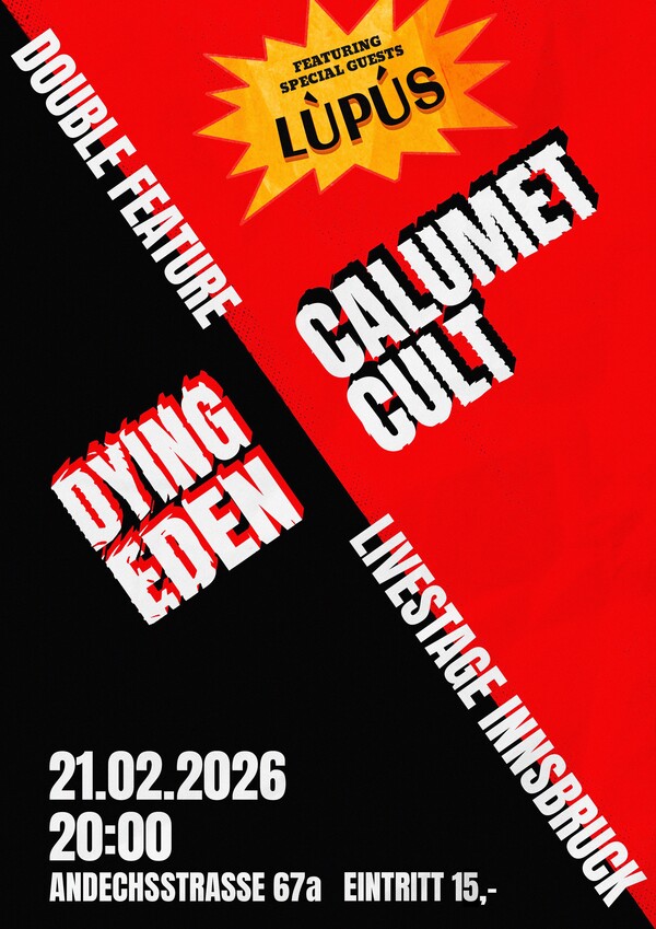 Das Double Feature am 21.02.2026 mit Dying Eden und Calumet Cult verspricht einen Abend voller mitreißender Riffs und hochenergischer Stimmung. Die eingessesene Groove Metal Band Dying Eden heizt das Innsbrucker Livestage ordentlich auf, während Calumet Cult das Publikum mit auf eine aufregende Reise durch Stoner und Psych Rock nimmt. Zusätzlich sorgt LÙPÚS als Special Guest für einen schwungvollen Auftakt dieses Abends.