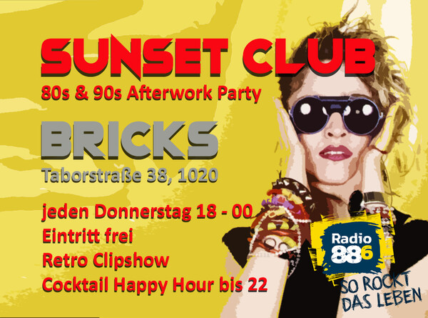 Fertig mit der Arbeit, Uni, Homeoffice etc. aber keine Lust mit der Party bis spät am Abend zu warten? Dann ab zum "Sunset Club" im Bricks! Vergiss den Alltag bei der besten Musik der 80er und 90er! Jeden Donnerstag von 18h bis 24h bekommst du genau die Afterwork Party mit der du entweder die restliche Arbeitswoche bewältigst oder schon das Wochenende einläutest! Hier findest du den idealen Platz zum chillen, tanzen, Freunde treffen und Cocktails trinken!