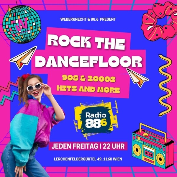 Wir rocken gemeinsam den Dancefloor im Weberknecht in Wien! 88.6 DJs rocken auf insgesamt 3 unterschiedlichen Floors mit Musik aus den 90ern und 2000ern (mit Videofloor) Und natĂŒrlich auch mit einem eigenen Rock Floor, auf dem zu Nu Rock und Nu Metal so richtig abgerissen wird!